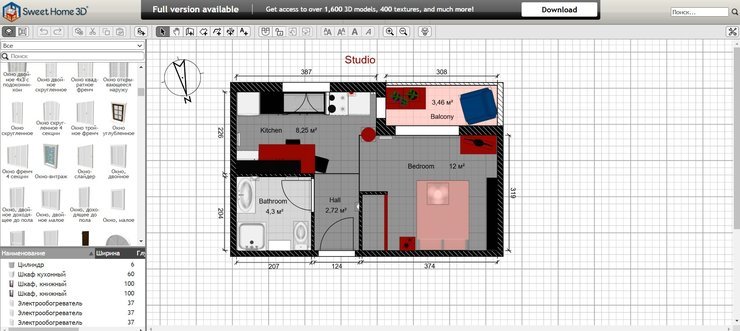 В Sweet Home 3D есть библиотека шаблонов с окнами, дверьми, техникой и предметами мебели. Доступен небольшой выбор планировок квартир, например двушки или студии, если не хочется строить план с нуля.