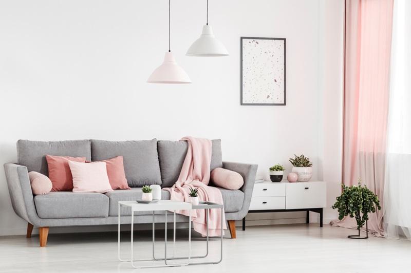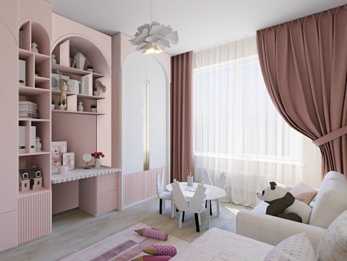 Пудровый розовый — нежный приглушённый оттенок. Используется как дополнительный цвет или деликатный акцент в шторах, диване, ковре и декоре. Лучше всего сочетается с пастельными тонами.