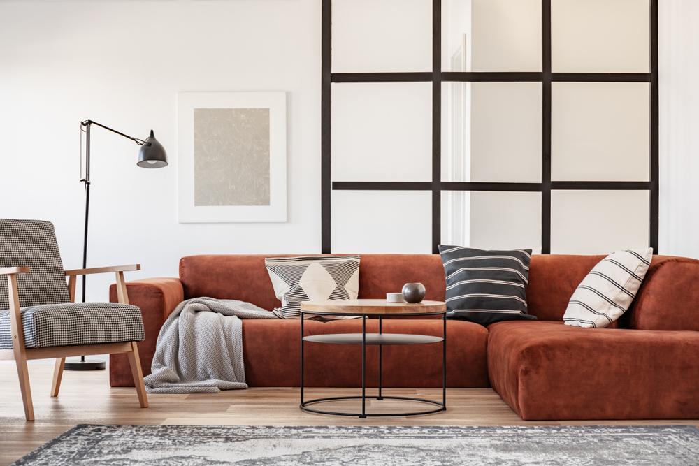 Терракотовый — землистый оттенок от мягкого кирпичного до насыщенного ржавого. Идеально подойдёт для мягкой мебели в гостиную или спальню в стиле бохо и неоклассике.