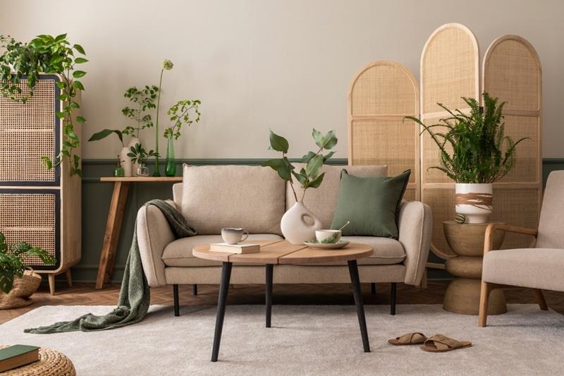 Песочный — от светло-кремового до глубокого золотисто-коричневого. Может создать как универсальную базу, так и яркие акценты. Особенно популярен в экостилях, легко комбинируется с серо-зелёным.