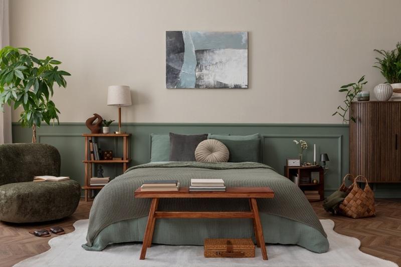 Оливковый — приглушённый зелёный с серым подтоном. Он поддерживает экотренды, отлично гармонирует с кремовым или песочным фоном.