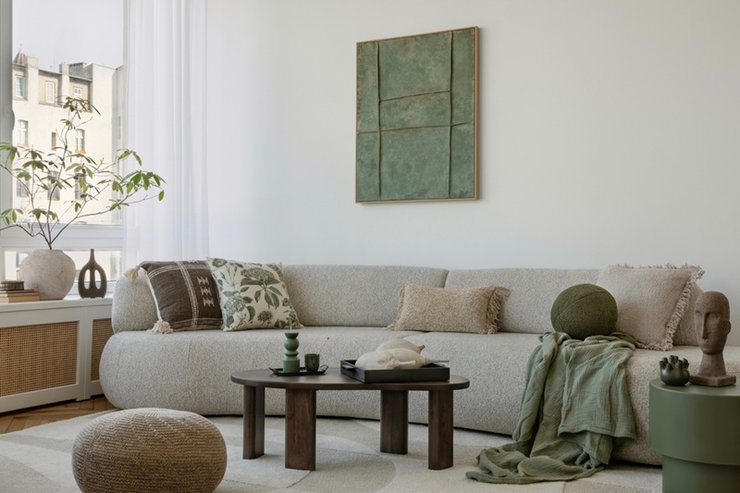 Например, если мы хотим взять диван и кресло одного цвета, по фактуре и форме им нужно отличаться. Либо текстура может быть одинаковой, но тогда оттенки должны быть разными. Например, зелёный насыщенный и припылённый.