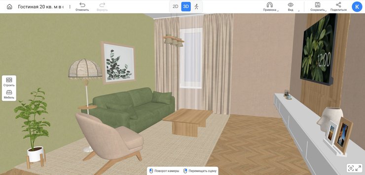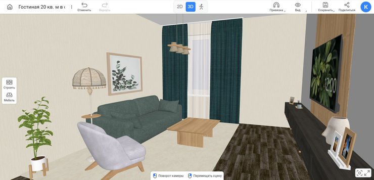 Для создания дизайна интерьера мы использовали РумПлан 3D. Удобно, что в этом сервисе есть 800+ моделей мебели, 1 600+ отделочных материалов, понятное меню. Можно менять текстуры, масштабировать рисунок и задавать ему направление.
