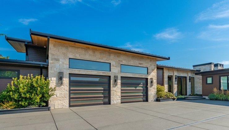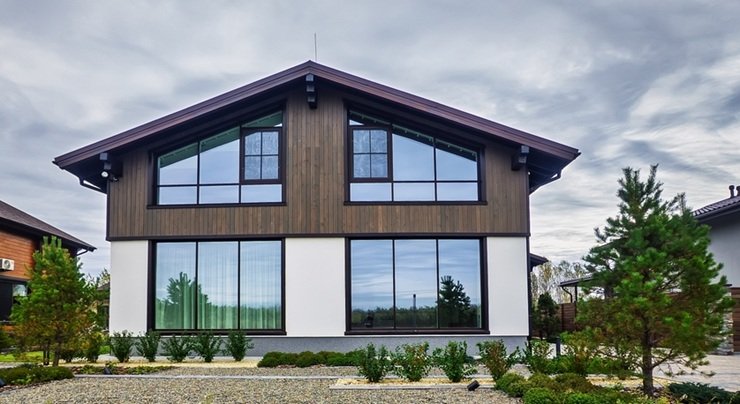Такое решение часто используют для строений в стиле минимализм: удобно встраивать большие окна и можно проектировать комнаты с высокими потолками.