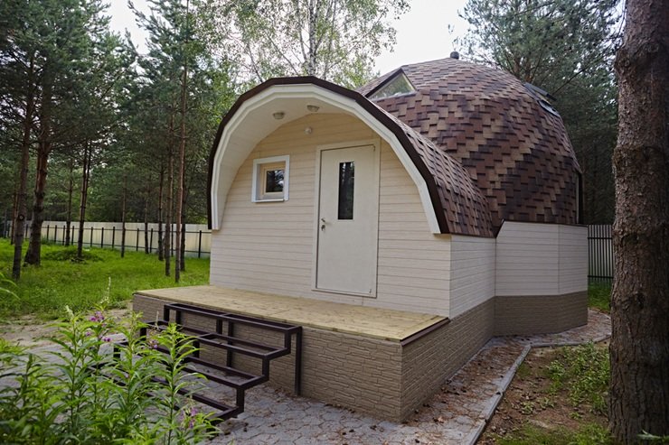 Одно из главных преимуществ такой конструкции — отсутствие традиционных стропил (наклонных балок). Благодаря выпуклым рёбрам и отсутствию ендов снег и вода не скапливаются на крыше.