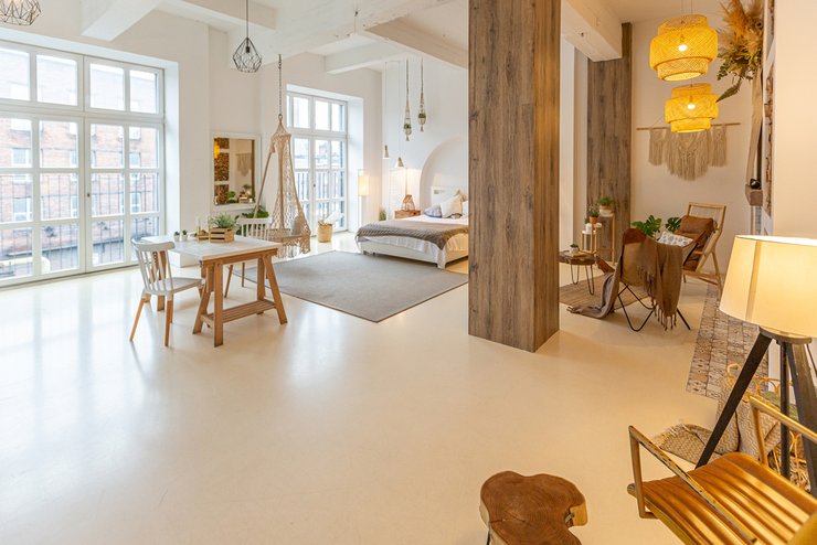 В лофте можно не прятать конструкции: балки, бетон, крупные светильники и открытые коммуникации делают высоту частью характера интерьера.