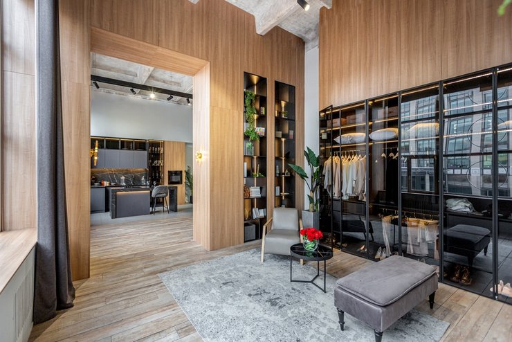 При высоте потолков от 3 м и выше удастся обустроить антресольный этаж. Этот вариант дизайнеры часто предлагают владельцам квартир, чтобы увеличить полезную площадь жилья. На антресоли обычно располагают спальню, а под ней — гардеробную, кабинет, кухню, лаунж-зону с диваном, креслами и телевизором или любую комнату, в которой жильцам не надо проводить долгое время стоя. Высоту помещения под антресолью иногда рассчитывают по росту самого высокого жильца + 10–15 см.
