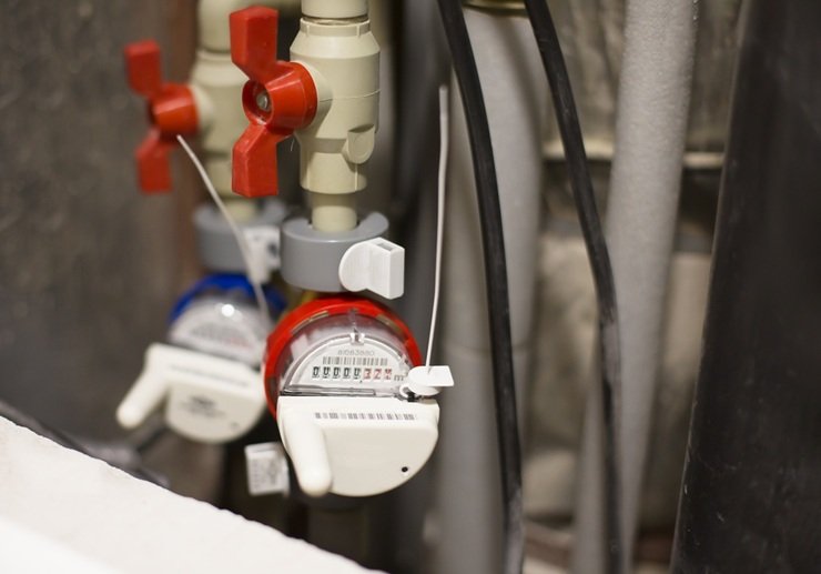 Над счётчиками — вентили на трубах с горячей и холодной водой. Фото: Ksenia4162 / Shutterstock / Fotodom