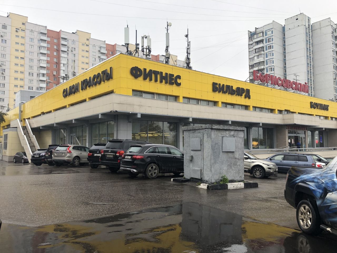 На территории есть парковка - наземная, 3 входа, в здании есть банкомат, салон красоты, ресторан, супермаркет, аптека, отделение банка, игровая комната, фуд-корт, фитнес-центр, кафе.